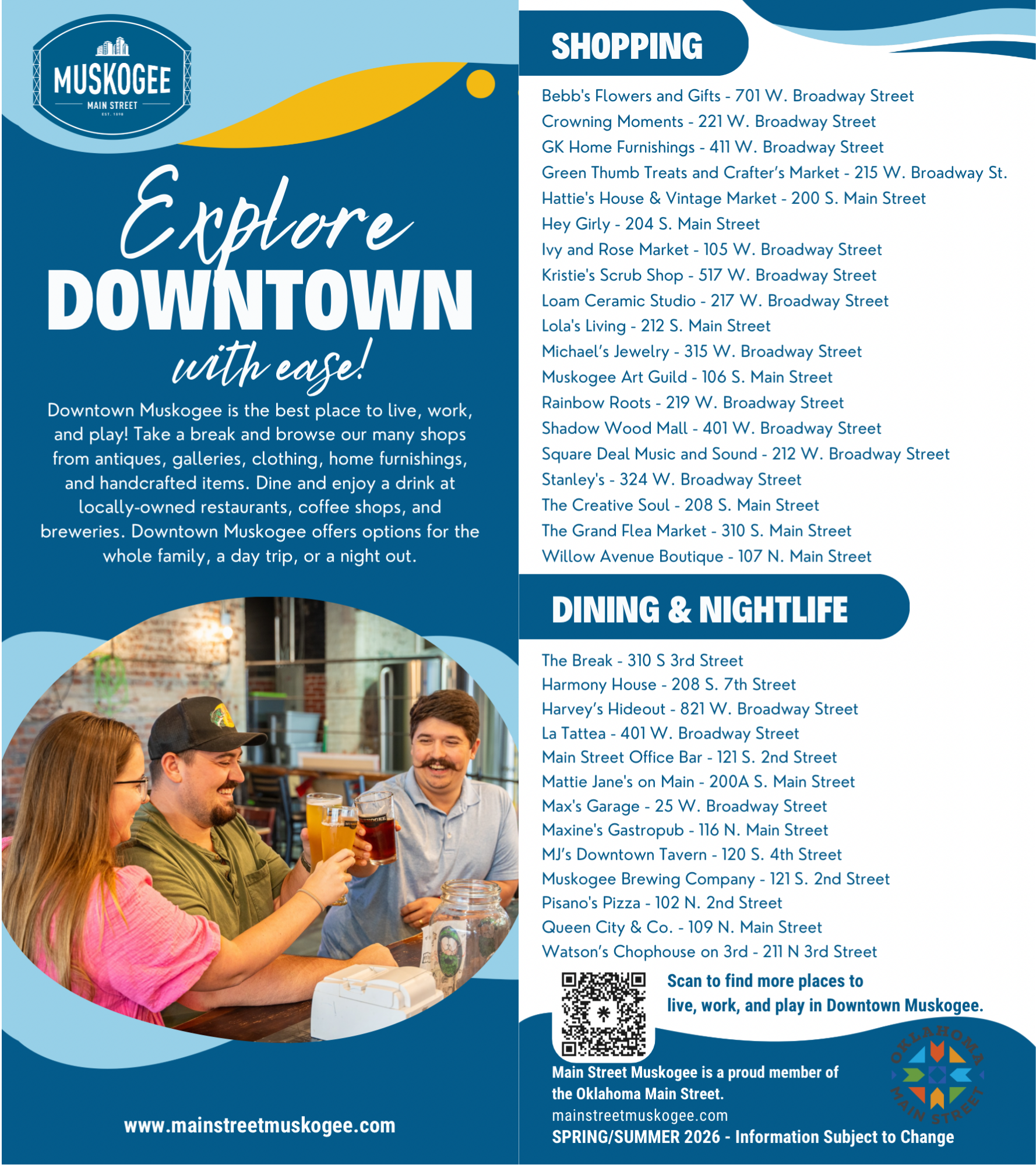 Please enjoy our Spring/Summer 2026 Shopping, Dining, and Nightlife information. Patience is key as we work on updating the Main Street Muskogee website to ensure a smooth and successful process for more information. We appreciate everyone's understanding as we strive to bring you an improved online experience. For inquiries about downtown Muskogee please contact our office at info@mainstreetmuskogee.com or 918-923-3868.